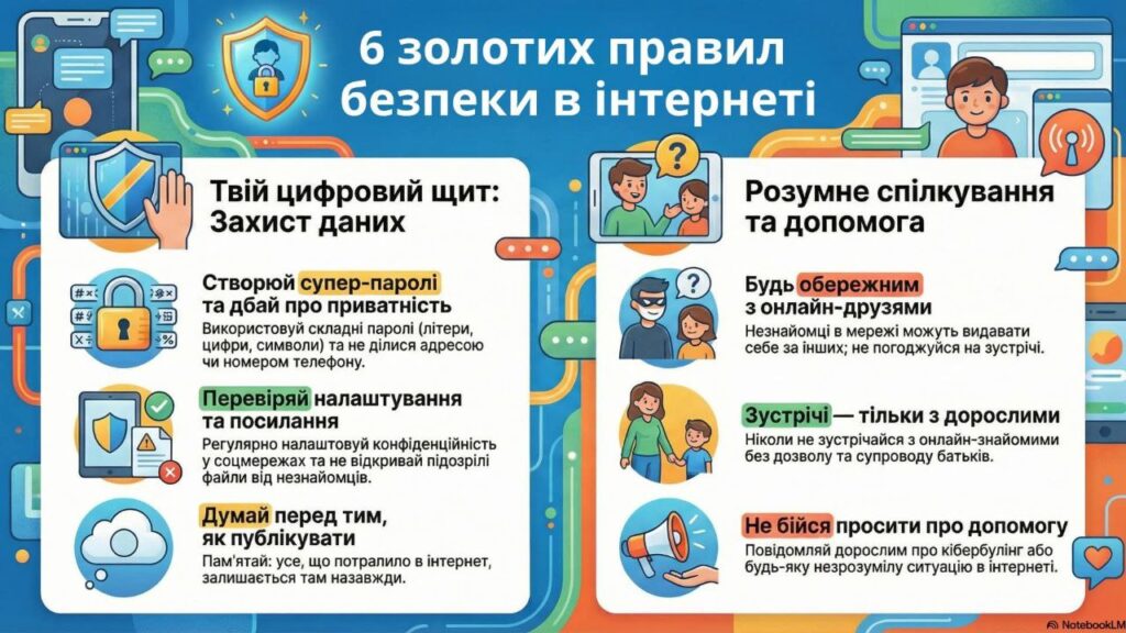 - говорити з дитиною про безпеку в інтернеті та допомагати розвивати критичне мислення, вчити робити аргументований вибір та нести відповідальність за його результати;