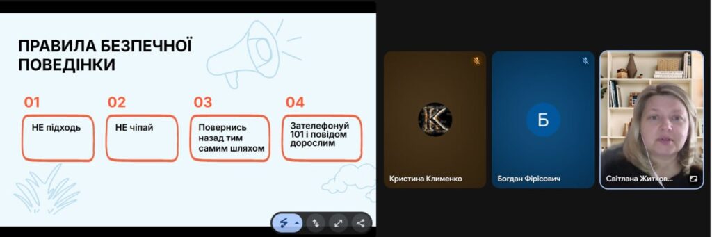 Учні ознайомилися з основними ознаками небезпечних предметів, алгоритмом дій у разі їх виявлення та правилами поведінки в потенційно небезпечних зонах.Особливу увагу було приділено важливості принципу: “Не підходь! Не чіпай! Повертайся тим самим шляхом! Телефонуй 101!”