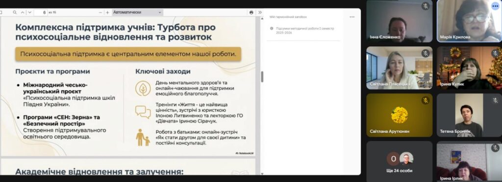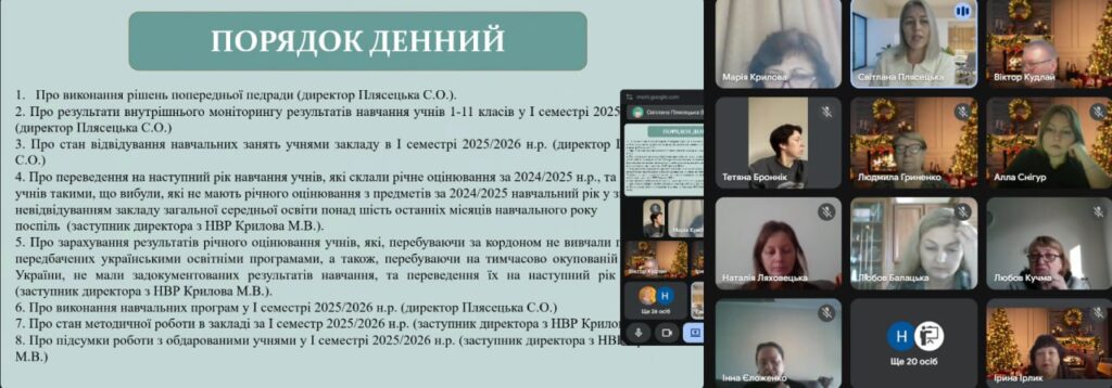 Сучасна школа — це не лише про оцінки, а й про успішну соціалізацію, психологічний комфорт та постійний розвиток. Саме цій темі була присвячена педагогічна рада колективу Ліцею №2 Таврійської МР за підсумками І семестру 2025/2026 навчального року.Це була не просто нарада, а справжній брейншторм: натхненний, цифровізований, з візуалізацією та живим діалогом!📌Про що говорили?Ключові акценти розставили наші спікери:🔹 Освітній процесДиректорка ліцею Світлана Плясецька презентувала результати навчання 1-11 класів, проінформувала стан виконання навчальних програм та аналіз відвідування. Ми тримаємо руку на пульсі успішності кожного учня.🔹 Гнучкість та підтримкаЗаступниця директора з НВР Марія Крилова висвітлила важливі питання: рух учнів, моніторинг якості знань, а також механізми оцінювання дітей, які перебувають за кордоном або на ТОТ. Жодна дитина не має випасти з освітнього процесу! Також пані Марія доповіла про методичну роботу, успіхи обдарованих учнів та безперервний професійний розвиток наших педагогів.🔹 Виховання та безпекаЗаступниця директора з НВР Ольга Скачкова яскраво презентувала аналіз виховної роботи. Профілактика булінгу, здоровий спосіб життя та безпечне середовище навіть в умовах дистанційного навчання — наш пріоритет.🔹 Психологічний комфортПрактичний психолог Наталя Ляховецька розповіла про впровадження «Шкільної стратегії благополуччя» у рамках міжнародного чесько-українського проєкту. Ментальне здоров’я учасників освітнього процесу — понад усе.Завершили зустріч рефлексивним «криголамом» настрою.Колеги підтвердили: місія І семестру виконана, і ми готові з новими силами рухатися далі!🎉 Вітаємо нашу велику шкільну родину:Учнів — з веселими канікулами! Вчителів — з успішним завершенням І семестру! • Батьків — із досягненнями ваших дітей! З прийдешнім Новим роком! Нехай він наблизить нашу спільну ПЕРЕМОГУ! 🇺🇦З повагою – адміністрація Ліцею №2 Таврійської МР
