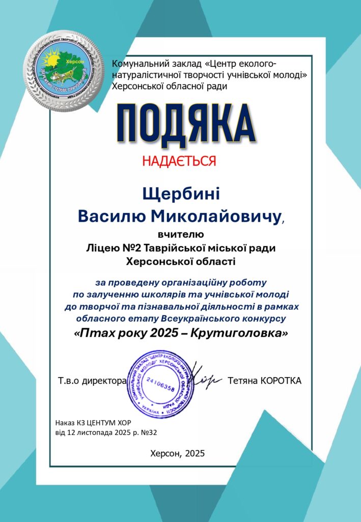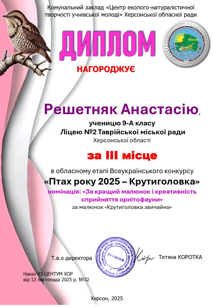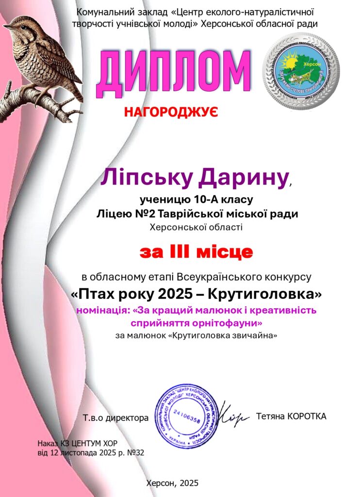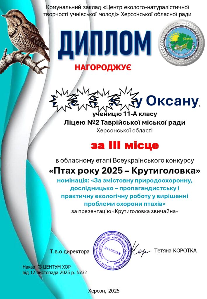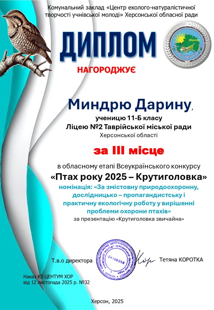 за ІІІ місце- Софію, ученицю 7-А класу – Оксану, ученицю 11-А класу – Миндрю Дарину, класу 11-Б класу- Нефьодову Валерію, ученицю 10-А класу – Чайку Катерину, ученицю 11-Б класу – Ліпську Дарину, ученицю 10-А класу – Решетняк Анастасію, ученицю 9-Акласу.Подяку за організаційну роботу в рамках обласного етапу Всеукраїнського конкурсу «Птах року 2025 – Крутиголовка Jynx torquilla» отримав вчитель біології Щербина Василь Миколайович.