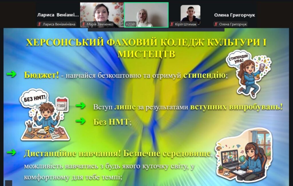 У ліцеї відбулася профорієнтаційна зустріч учнів 11-х класів із представниками Херсонського фахового коледжу культури і мистецтв.Під час зустрічі майбутні випускники у форматі творчого представлення ознайомилися з освітніми програмами коледжу, умовами вступу, особливостями навчання та перспективами професійного розвитку у сфері культури і мистецтв. Представники закладу в креативних відео розповіли про спеціальності, творчі напрями підготовки, а також поділилися досвідом студентського життя.Учні мали змогу поставити запитання та отримати відповіді щодо вступної кампанії, творчих конкурсів і можливостей реалізації своїх здібностей.Зустріч стала корисною для старшокласників, адже допомогла їм краще зорієнтуватися у виборі майбутньої професії та зробити перший крок до успішного професійного шляху.