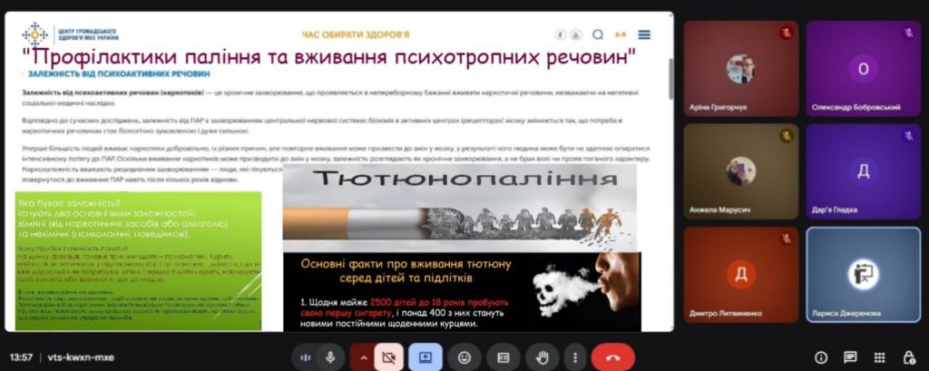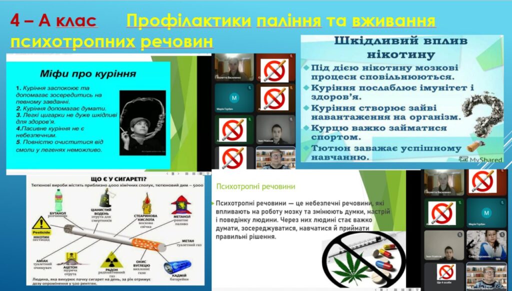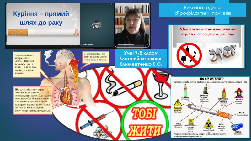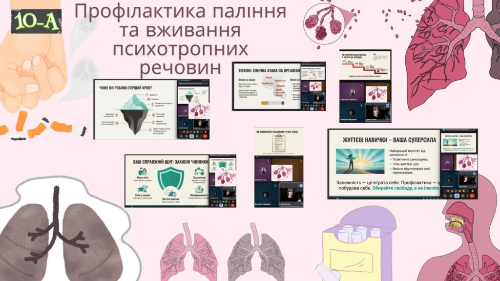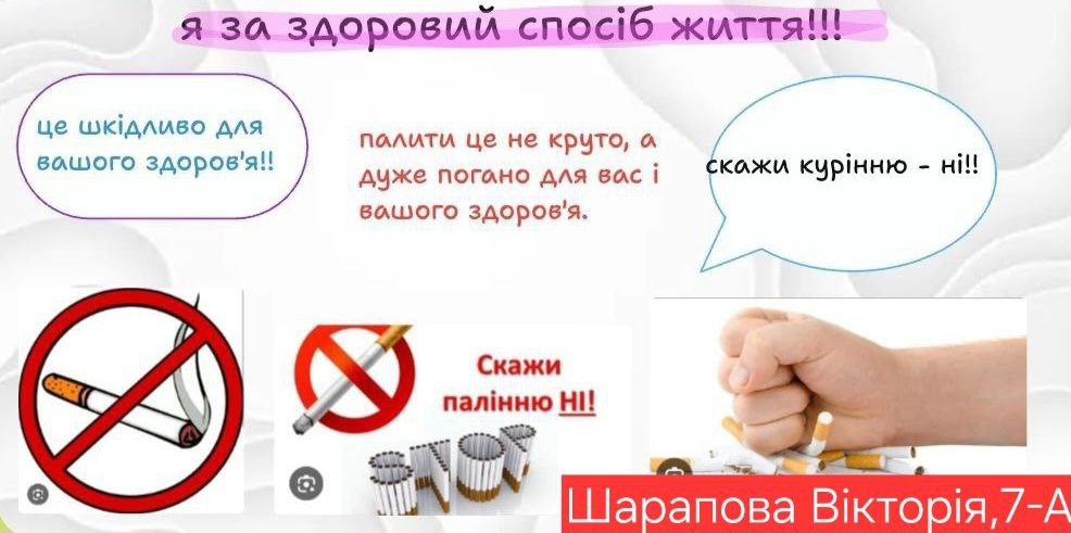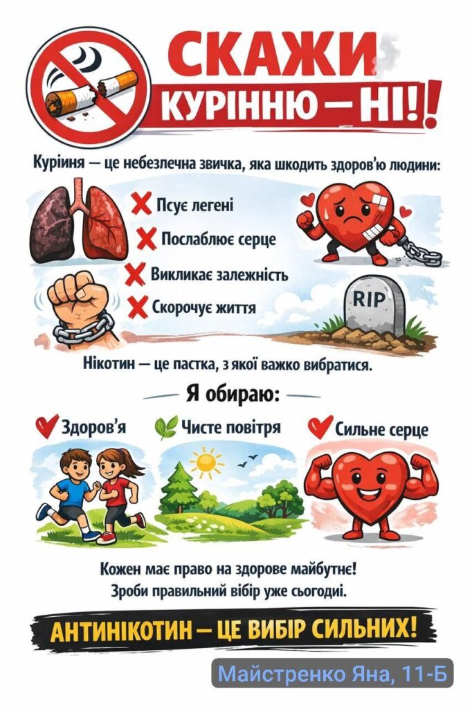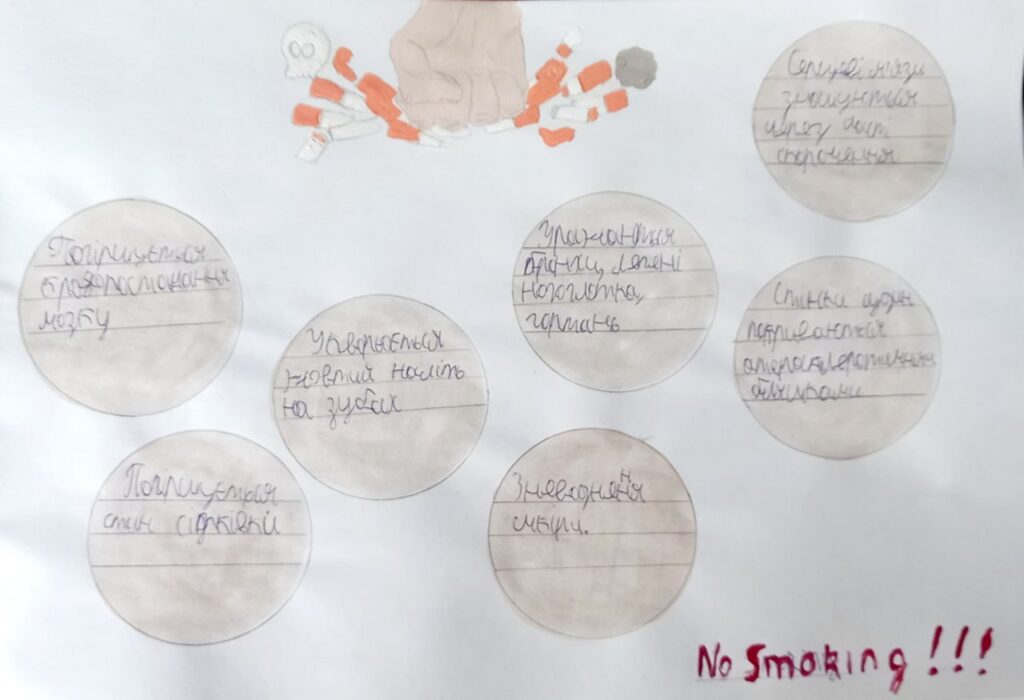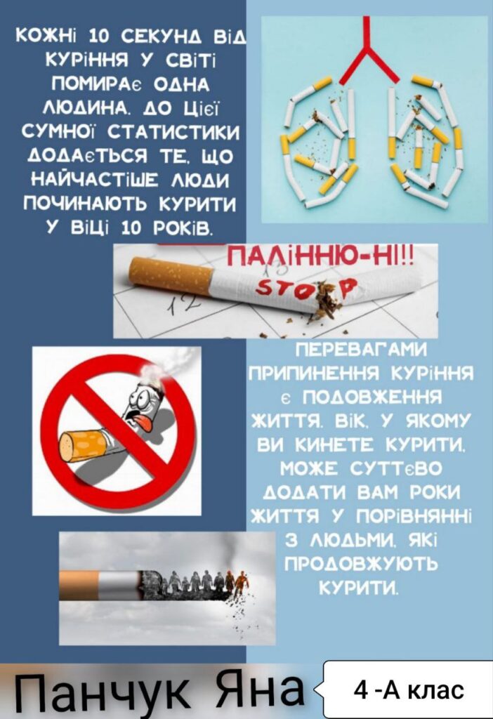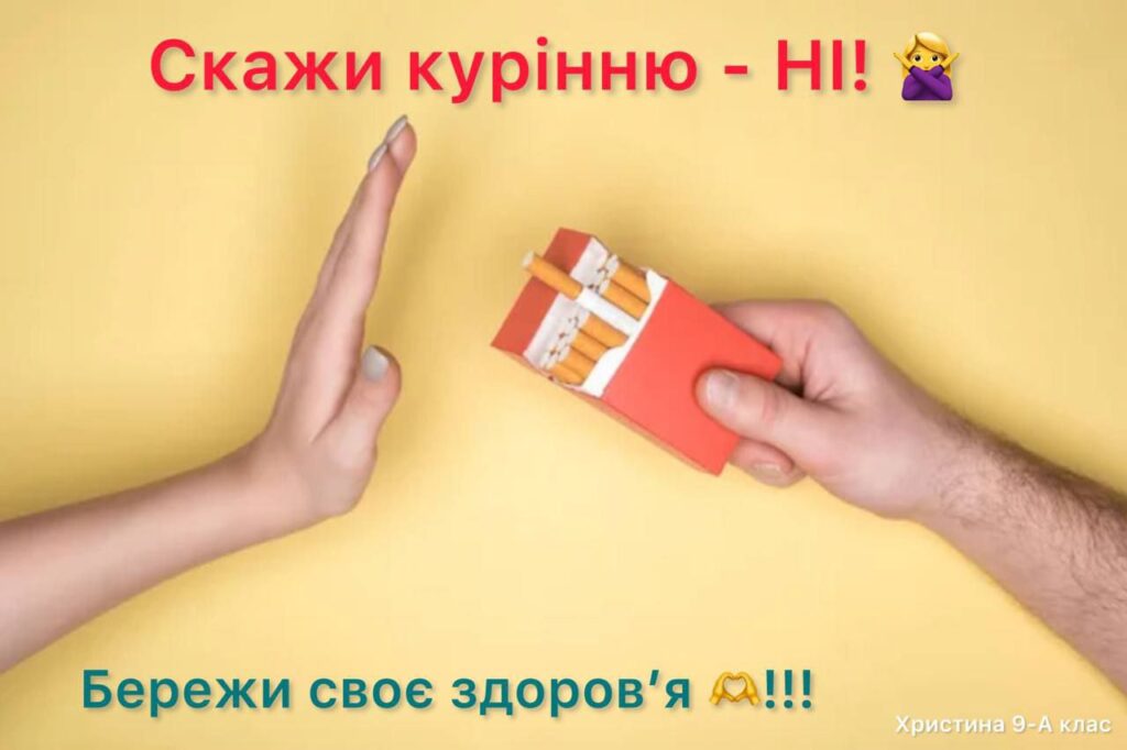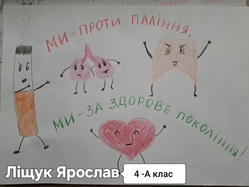 У нашому ліцеї відбувся Тиждень профілактики паління, протягом якого учні та вчителі спілкувалися про те, чому паління шкодить здоров’ю, як воно впливає на серце, легені та настрій людини. Діти брали участь у цікавих бесідах, іграх, переглядали і обговорювали відео та виконували творчі завдання. З учнями 7-х класів практичний психолог Наталья Ляховецька провела виховній тренінг “План здорового способу життя”.Участь у таких заходах – це можливість зробити правильний вибір: здоров’я та спорт, а не паління. Діти вчилися говорити “ні” шкідливим звичкам, підтримувати одне одного та обирати активний і здоровий спосіб життя. Паління — це дуже погана звичка, яка шкодить здоров’ю.Краще обирати здоров’я: займатися спортом та дихати чистим повітрям! ПАЛІННЮ – НІ!