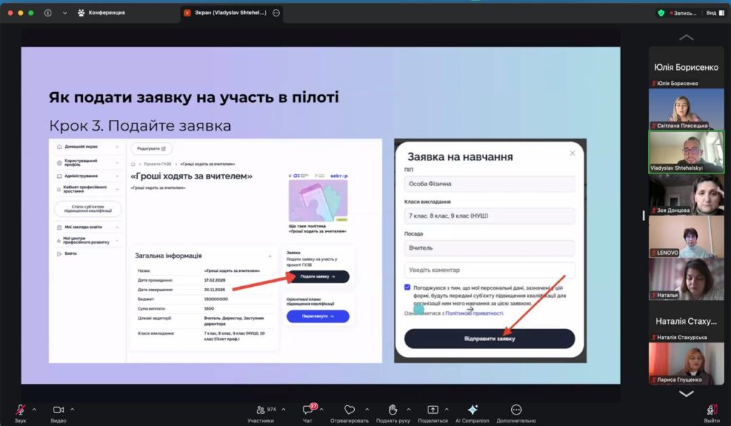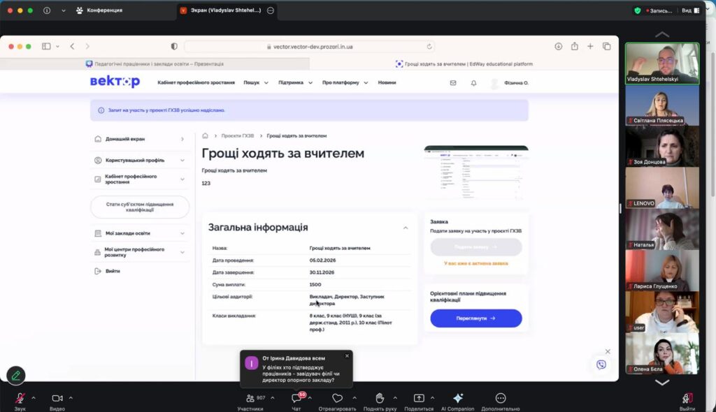 Директор Ліцею №2 Таврійської МР Світлана Плясецька та заступник директора Марія Крилова взяли участь у регіональному вебінарі, організованому Міністерством освіти і науки України, щодо поширення інформаційних матеріалів та підтримки впровадження експериментального проєкту з підвищення кваліфікації і супервізії педагогічних працівників закладів загальної середньої освіти.Під час заходу було представлено механізм реалізації політики «Гроші ходять за вчителем», а також окреслено особливості закупівлі послуг із підвищення кваліфікації та супервізії в межах експериментального проєкту, затвердженого постановою Кабінету Міністрів України від 05 листопада 2025 року № 1439. Окрему увагу приділено ролі керівників закладів у забезпеченні відкритості, поінформованості педагогів і належного супроводу пілотування нового механізму фінансування професійного розвитку.Учасників поінформовано про необхідність розміщення на офіційних ресурсах інформаційних та інструктивних матеріалів, зокрема щодо процесу верифікації закладів освіти із застосуванням КЕП та/або BankID, який розпочинається з 16 лютого. Також презентовано можливості платформи «Вектор» для організації та обліку підвищення кваліфікації педагогічних працівників.Участь керівництва ліцею у вебінарі спрямована на своєчасне інформування педагогічного колективу, належну організацію процесів верифікації та впровадження нового механізму фінансування професійного розвитку в закладі. Працюємо системно, з розумінням відповідальності за якість освітнього процесу та професійне зростання наших педагогів.